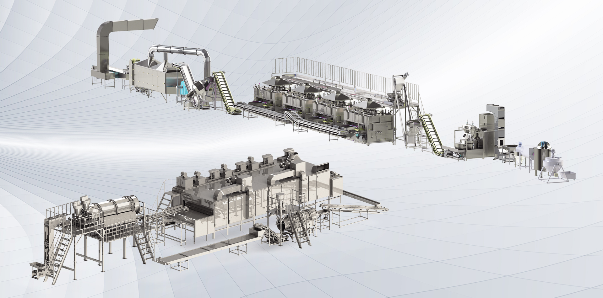 該生產線結合多種堅果加工工藝,一條生產線可加工多種堅果。如:開心果、夏威夷果、碧根果、巴旦木、紙皮核桃、瓜子、鹵味花生果等。1.PLC中央控制系統,自動化程度高。2.可根據客戶需求定制。